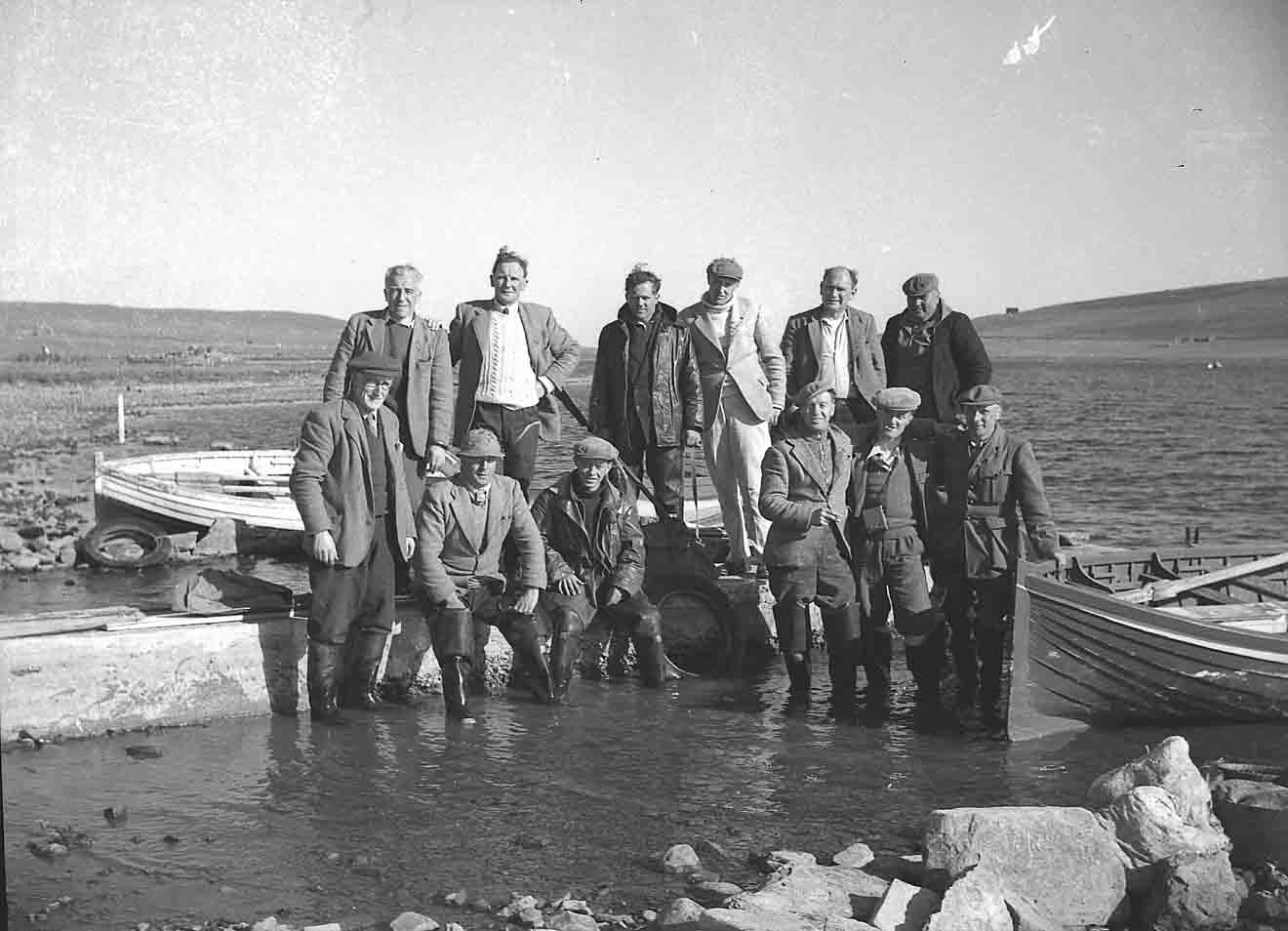 Fishermen at Loch of Boardhouse, Birsay, for the 1955 Inter-County competition. Orkney retained the trophy.