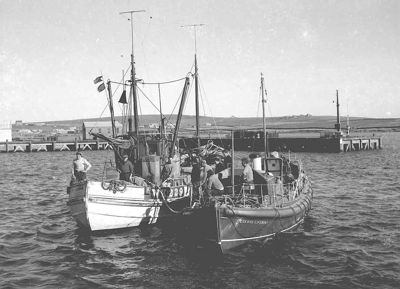 The Reserve Lifeboat towing Wick fishing boat 'Enterprise' into Stromness after she broke down off Hoy, c.1959.