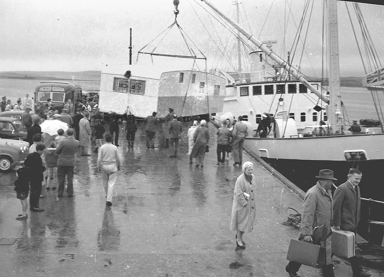 The largest ever caravan to have been carried on the MV St. Ola is unloaded at Stromness. The caravan belonged to Kenneth Firth of Stromness and measured 45 feet by 10 feet, 1963. See Orcadian 22/8/1963, page 5.