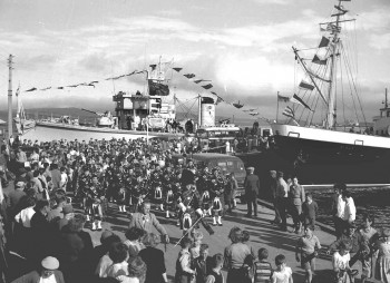 The Bucksburn Pipe Band, having just arrived in Stromness, march down the pier on the first day of Stromness Shopping Week, 1956. M.V. St. Ola is on the right and minesweeper HMS Kilmorey is in the background. See Orcadian 26/7/1956, page 5.