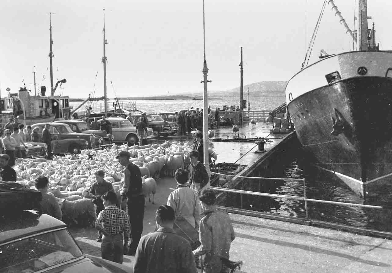 A flock of sheep being unloaded from the steamer 'St. Ola' at Stromness Pier, c.1950s.
