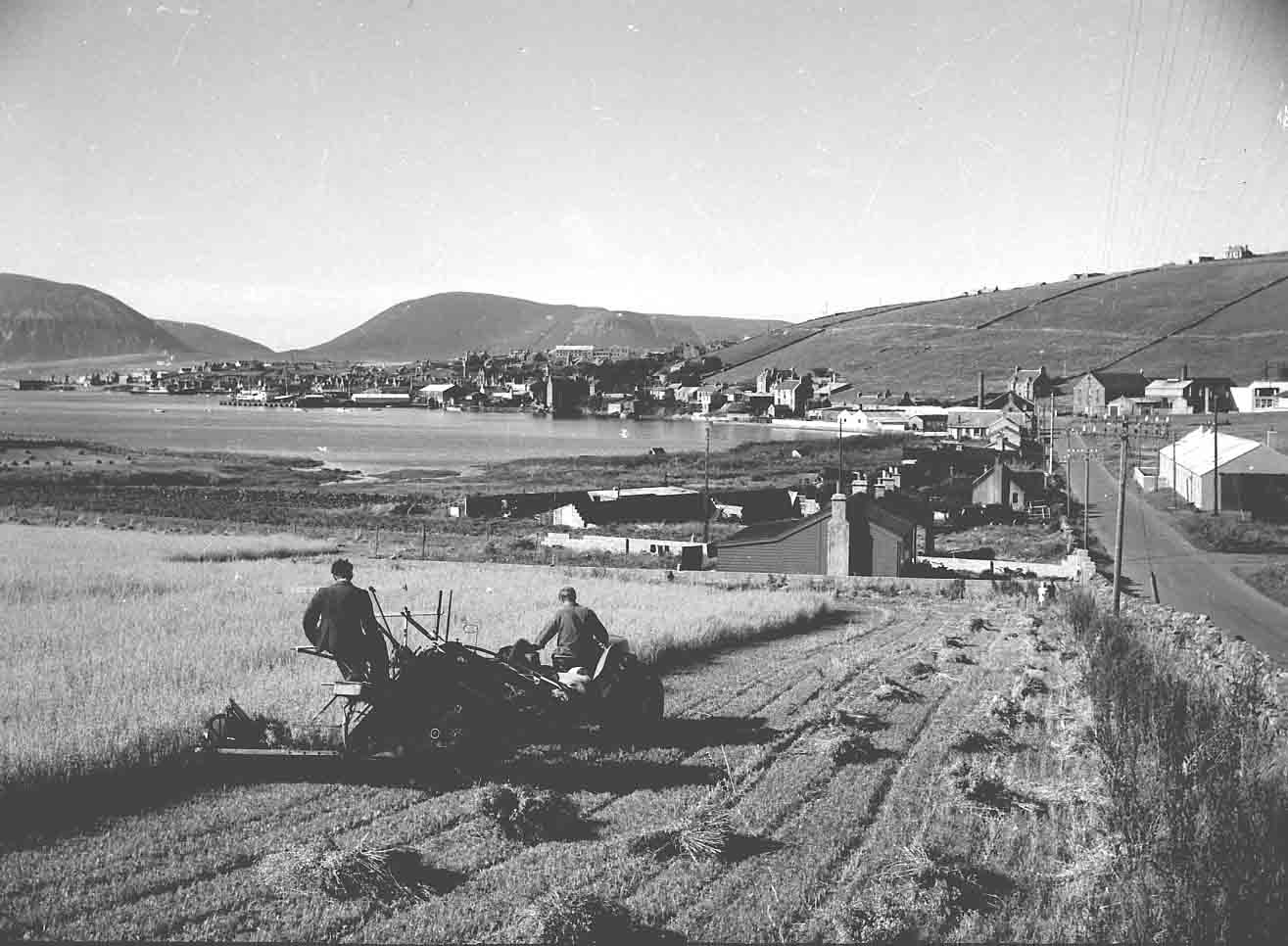 Harvesting with a Tractor and Binder at Garson, with Stromness in the background, c.1950s.