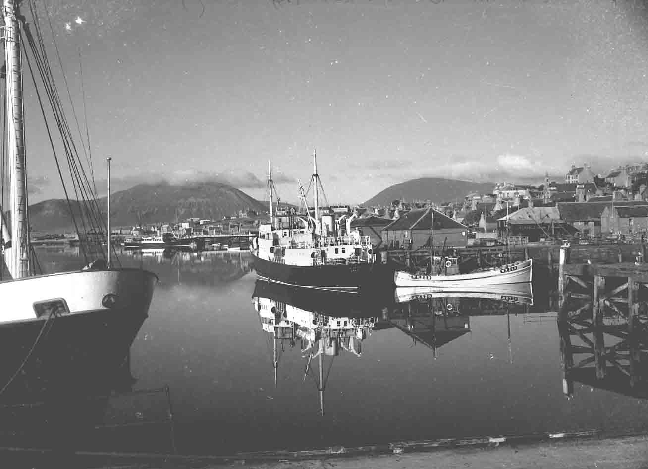 Stromness Harbour at 5am on a summer morning, showing the M.V. St. Clement and the Seine Net Fishing boat 'Enterprise', c. 1954.