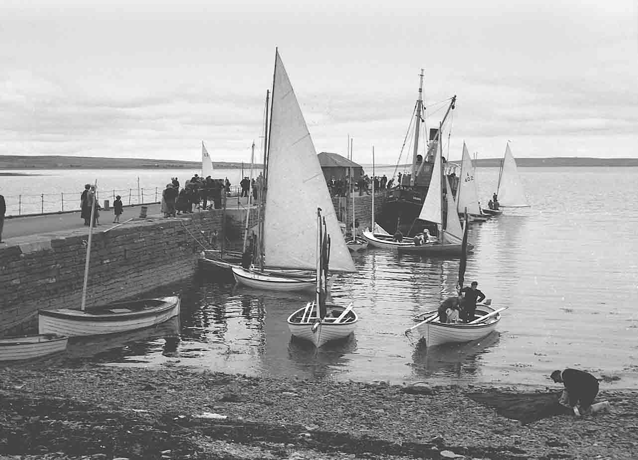Sailing dinghies at Longhope for the regatta, 28th July 1955, with the Steamer 'Orcadia' in the background. Article: Orcadian 4/8/1955, page 6.