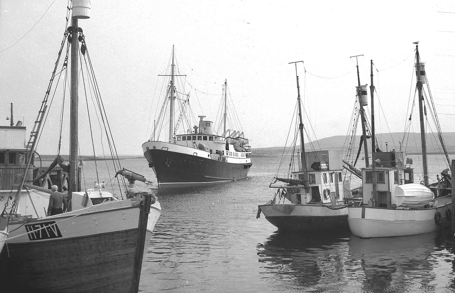 St. Ola approaching Stromness Pier, with Norwegian whaling boats in the foreground, date unknown.