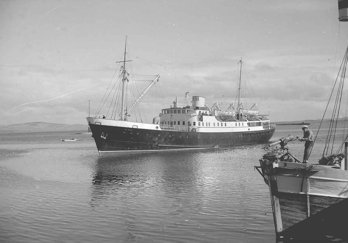 M.V. St. Ola approaching Stromness Pier with, on the right, a Norwegian Whale fisherman manning the harpoon gun, c.1950s.