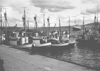 RMS St. Ola approaching Stromness Pier, c.1960. In the foreground are Norwegian fishing boats preparing for the whaling season.