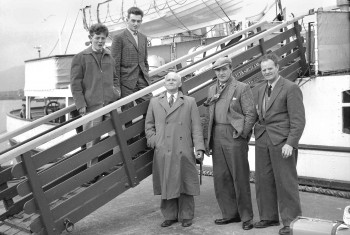 Two young men from Birsay leaving on the 'St. Ola' at Stromness Pier, May 1961. The two, (L-R) Stewart Spence of Palace Farm and William Tait of Ingsay, were emigrating to Australia. Standing below L-R: Davie Flett grandfather of Stewart Spence, Gillie Comloquoy of Palace, Birsay, and Geordie Tait, father of Billy Tait. See Orcadian 1/6/1961, page 5.