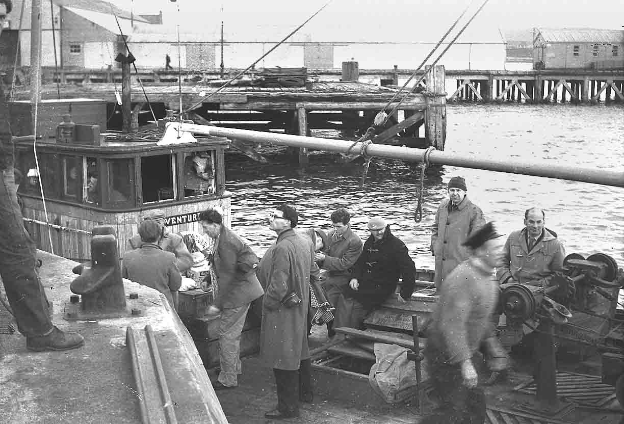 The Kirkwall Arts Club cast of 'The Long and The Short and The Tall' on board the lobster fishing boat 'Venture' which took them south to Thurso so that they could compete in the SCDA finals, 1963, which they won. See Orcadian 2/5/1963, page 5.