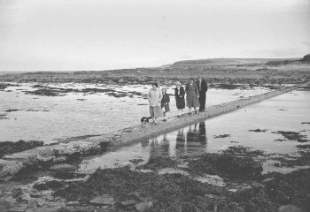 A group crossing over the causeway to the Brough of Birsay, c.1950s.