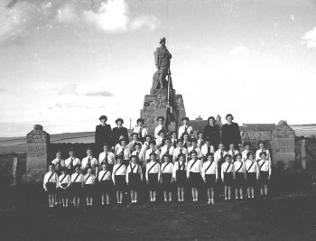 St. Margaret's Hope Girl Guides at the South Ronaldsay War Memorial, 1955.