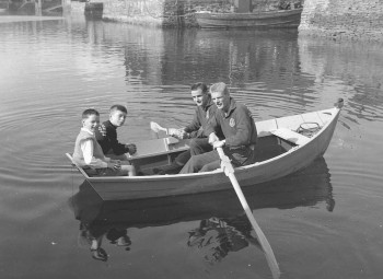 Boxers Dick McTaggart (Olympic Lightweight champion) and Danny Lee (British Flyweight champion) at the 1960 Stromness Shopping Week, with two promising young boxers from the Joe Aitchison Training School.