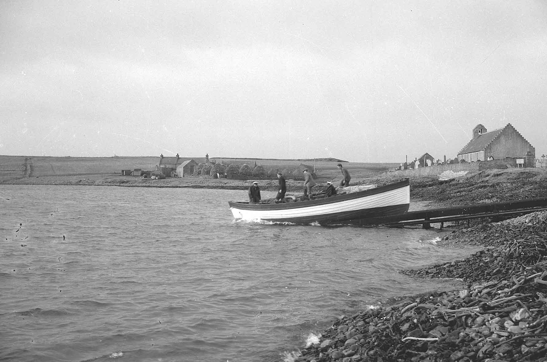 The Pentland Skerries relief boat leaving from Burwick, South Ronaldsay, with the old St. Mary's Church in the background. Date unknown.