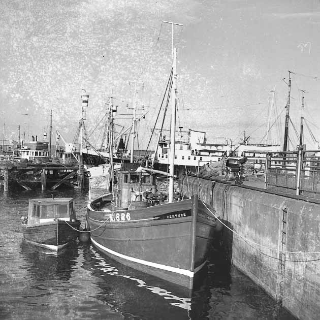 M.V. St. Ola approaching Stromness Pier, with the fishing boat 'Venture' in the foreground, c.1960s.