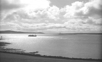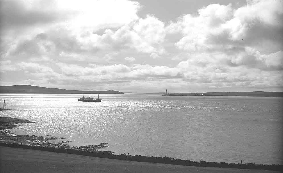 M.V. St. Ola approaching Stromness, with Hoy High Lighthouse, Graemsay, in the background, c.1950s.