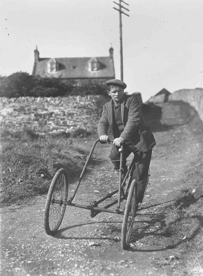 An unidentified man on a strange tricycle, date unknown.