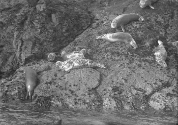 Seals basking on rocks, c.1950s.