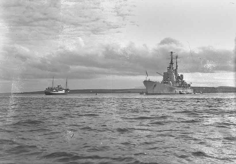 HMS Vanguard, then Britain's largest Battleship, and the Home Fleet in Scapa Flow, June 1954. See Orcadian 24/6/1954, page 5.