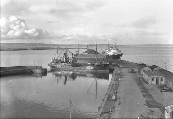 Kirkwall Pier, with the SS Orkney Trader entering the Basin and the Blue Cross Animal Food office on the right, c.1950s.