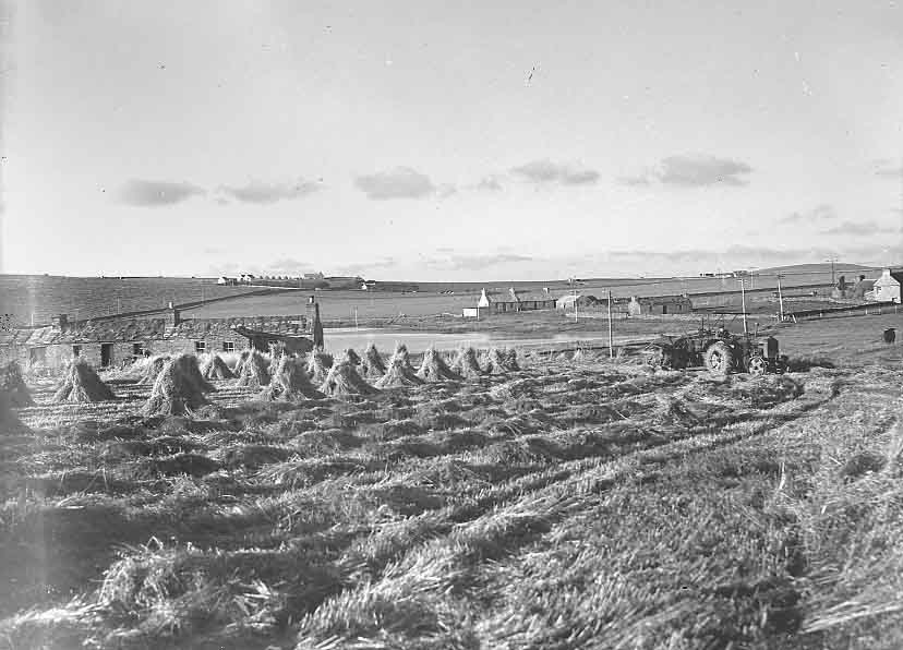 Harvesting with a tractor drawn Reaper beside Skaill Loch, Sandwick, date unknown. Kierfold House can be seen in the background.