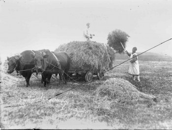 Gathering the harvest with an ox drawn cart on Graemsay, date unknown. Plate broken.