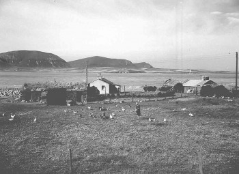 Feeding the hens in Orphir, with Hoy and Graemsay in the background. Date unknown.