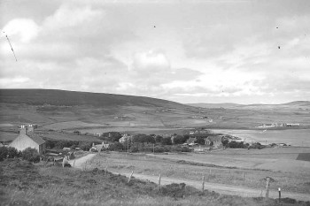 The view from the Heddle Hill, looking over Finstown, Firth, c.1950s. Firth School can be seen in the right middle distance.