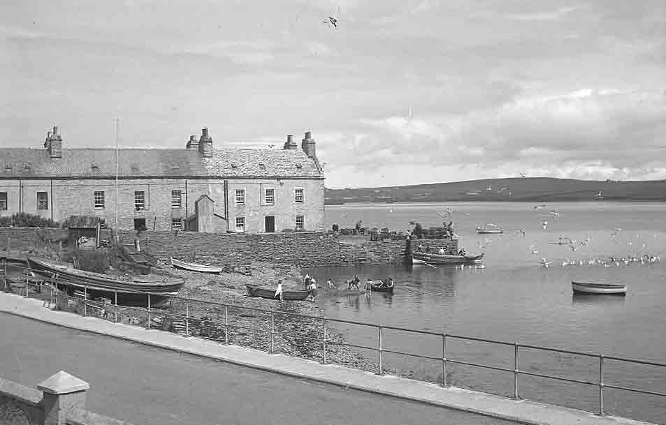 Children playing on the shore next to the Double Houses, Ness Road, Stromness, c.1950s.