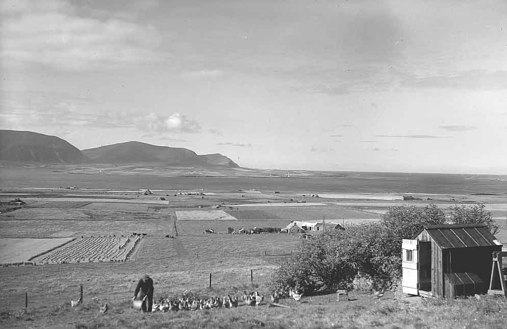 Feeding the hens in Orphir, c.1950s. Hoy High Lighthouse, Graemsay and Hoy are in the background.