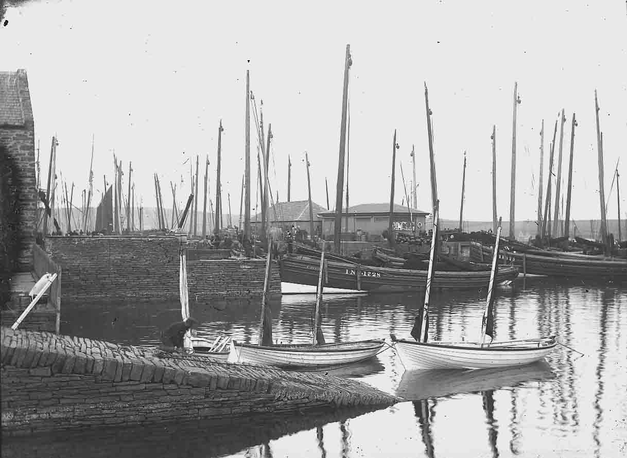 Fishing boats in Stromness Harbour, date unknown. In the foreground is, possibly, a South Isles yole at the Mason's Arms pier.