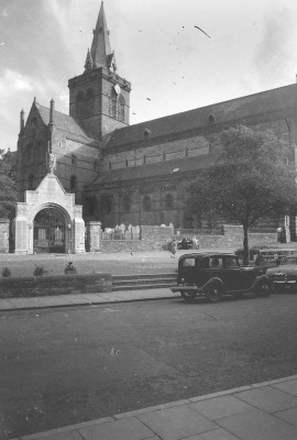 St. Magnus Cathedral, Kirkwall, with the Kirkwall & St. Ola War memorial, date unknown.