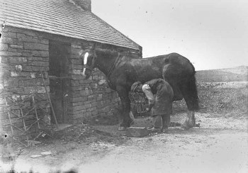 Copy negative showing John Isbister shoeing 'Nell' at the Brig, South Ronaldsay, date unknown.