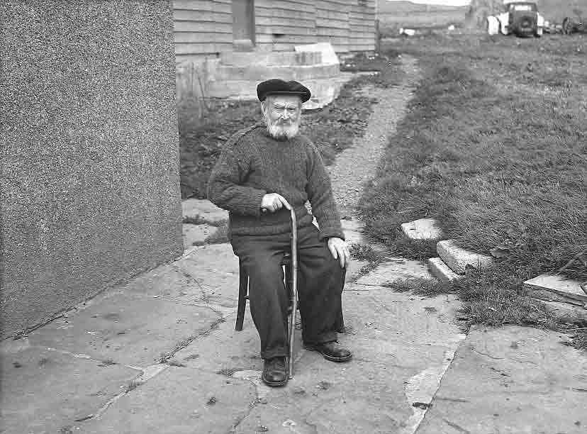 James Bremner, of Forswell, Yesnaby, Sandwick, c.1950s. He turned 100 on 24/11/1952 and was Orkney's only centenarian at that time. He was a farmer at Saltness, Longhope, until he retired. Then he went to live with his son at Forswell, Yesnaby, Sandwick. See Orcadian 19/3/1953, page 5.