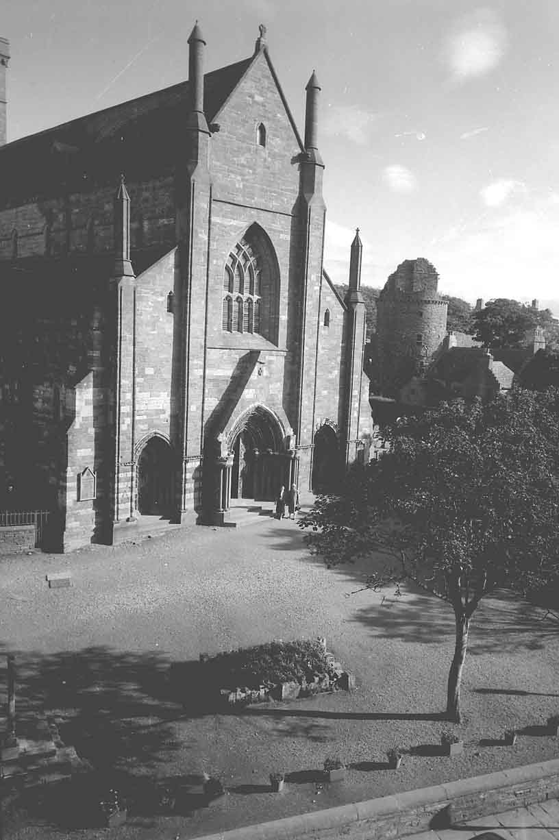 St. Magnus Cathedral, Kirkwall, date unknown. The tower of the Bishop's Palace is in the background.