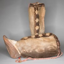 Sealskin boots, knee high Inuit boots. Bought from the Hudson's Bay Company store in Pangnirtung, Baffin Island in 1953. Brown sole with white skin top and fur legs, 2 colours with a brown strip up the front with four white stars. Red and white pleated drawstring round top.