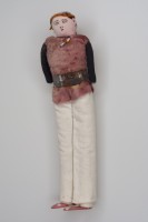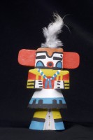 Beadwork doll with buffalo head, "spear", and drum brooch.
