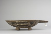 Wooden dish with handle and four feet. Carved base showing traces of black and white pigment.