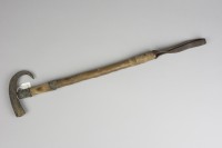 Wooden riding crop with ram horn on top. Leather strap bound at base to form a loop. The name "LUZERN" carved into the wood.