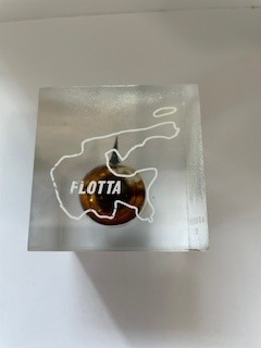 Clear acrylic cube with drop of oils suspended inside. Outline of the island of Flotta on front and