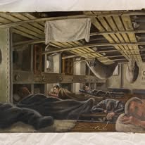 Unframed oil on canvas of the interior of troop ship with men asleep. Admirals Barge, Lyness c1940. Painted by Ian MacInness (1922 - 2003) who served aboard the Admiral's Barge from 1939.