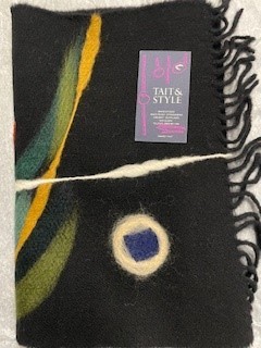 Black wool, needle felted half scarf with fringe at one end. Made in Stromnmess by Ingrid Tait of Tait and Style.