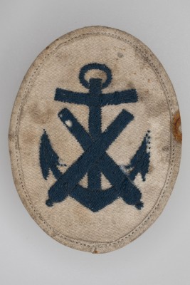 One of three fabric German naval arm badges. Blue stitching. Ammunition technician's mate's arm badge. 2.05.02 stamped on reverse.