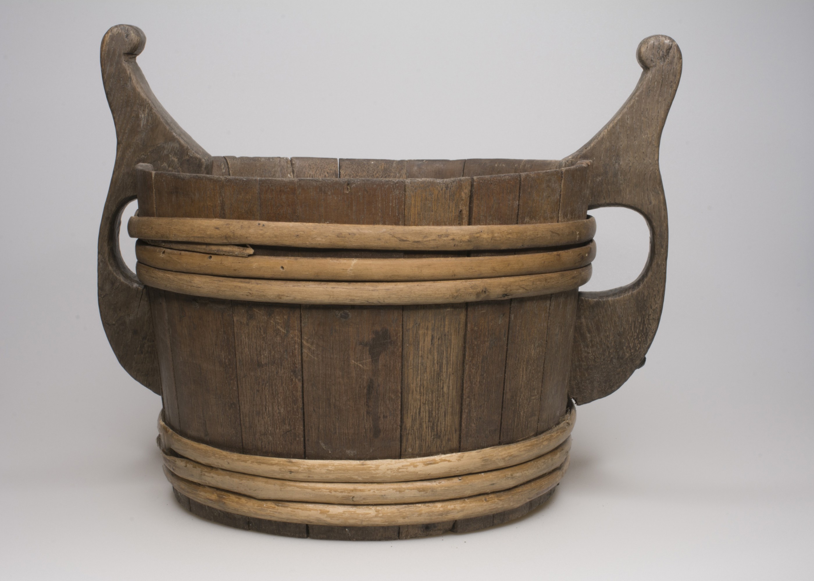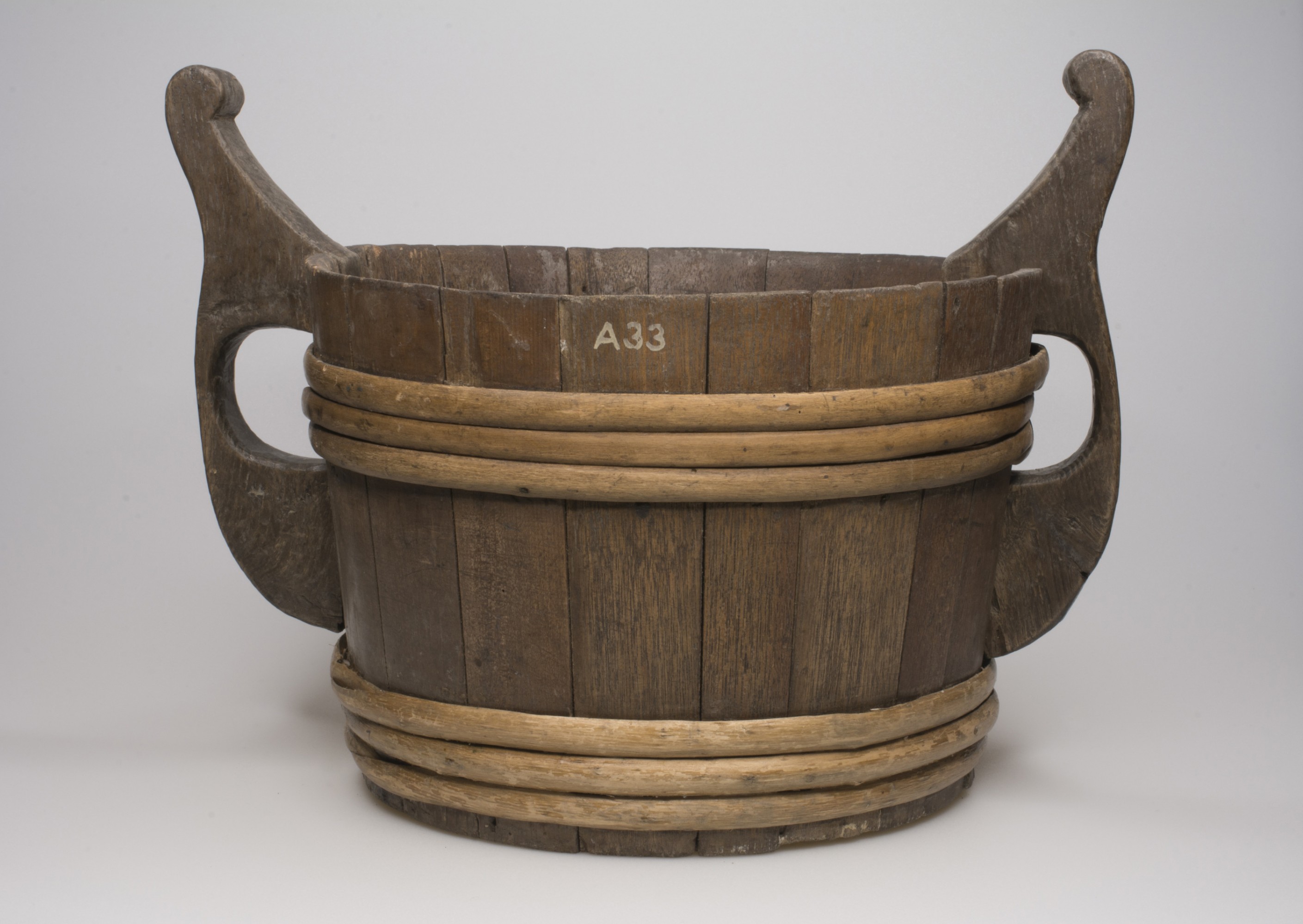 Two horned ale cog, made of sectors of wood, bound around with willow. Diameter 10" Height 7".