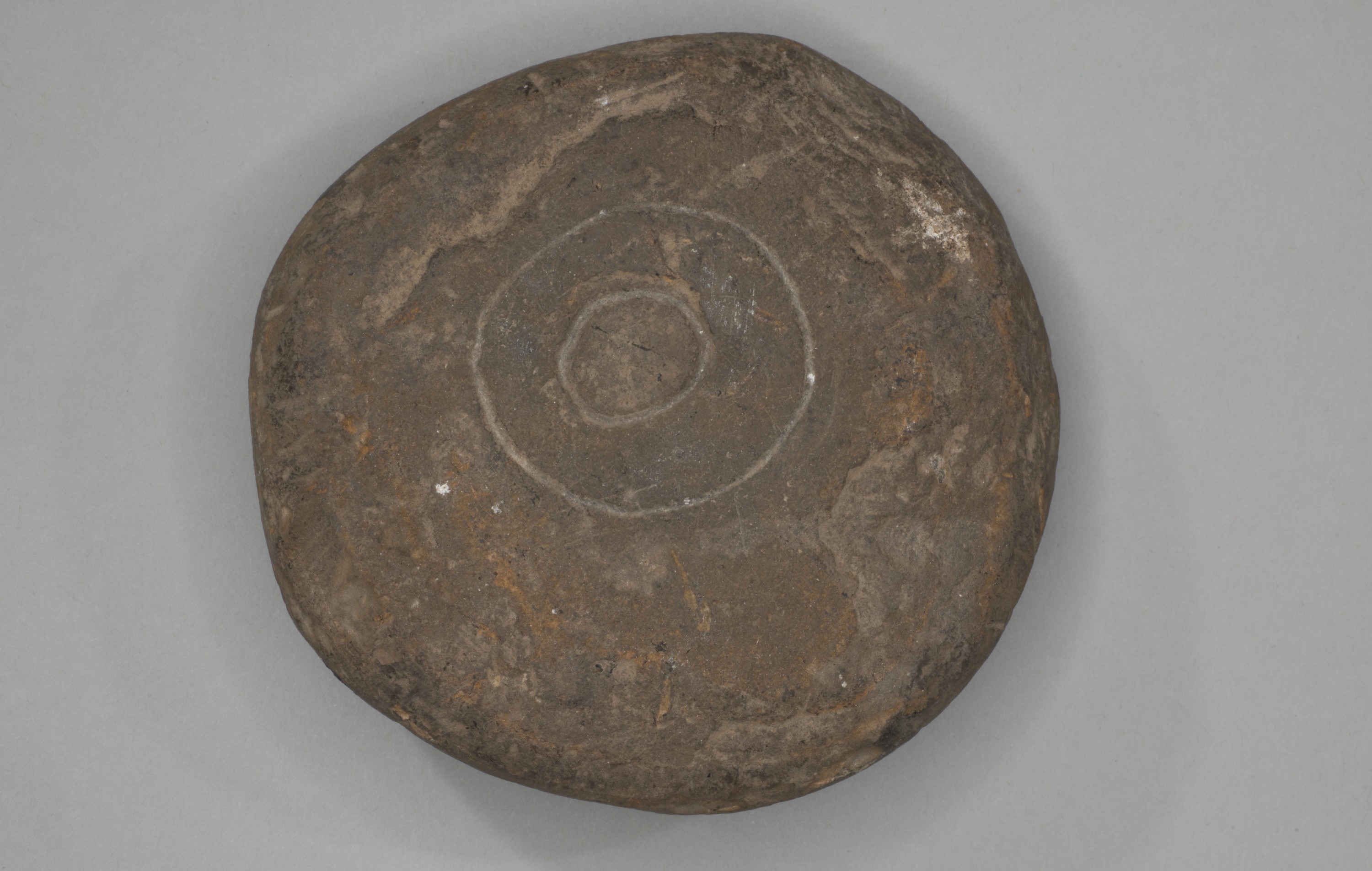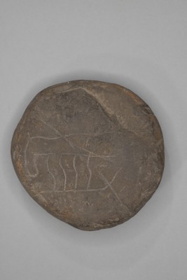 Rough stone with carvings: horse-like or longship carving on one side: circle within a circle on reverse.