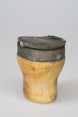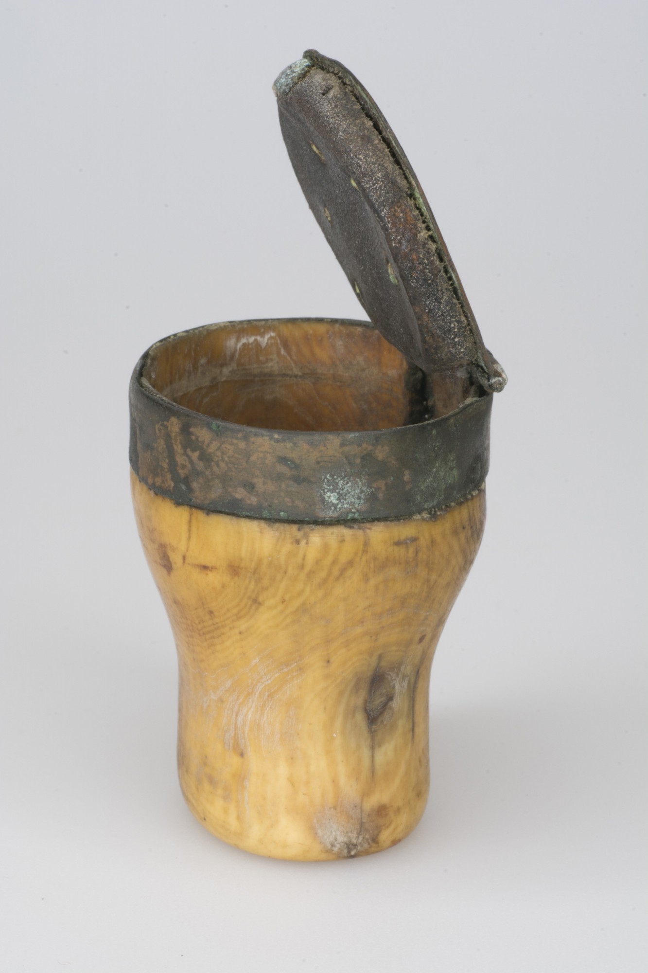 Snuff mull: horn, hinged metal lid and trim.