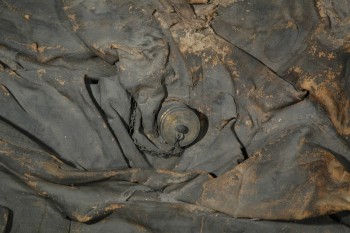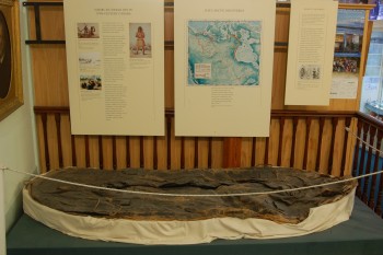 A remarkable survivor on display at Stromness Museum is one of only two existing Halkett inflatable boats dating from the 1840s. Lt. Peter Halkett was the son of John Halkett, a director in the Hudson’s Nay Company. He was interested in Arctic exploration and inspired to create a light-weight boat by Franklin’s Coppermine Expedition (1819-22), when they were stranded on the wrong side of the Coppermine River. Initially Halkett created a boat-cloak, that could be worn when not inflated. He later developed a larger boat, made from layers of cloth impregnated with Indian rubber, which could carry two people. It was carried in a rucksack and came with paddles and bellows to inflate it.