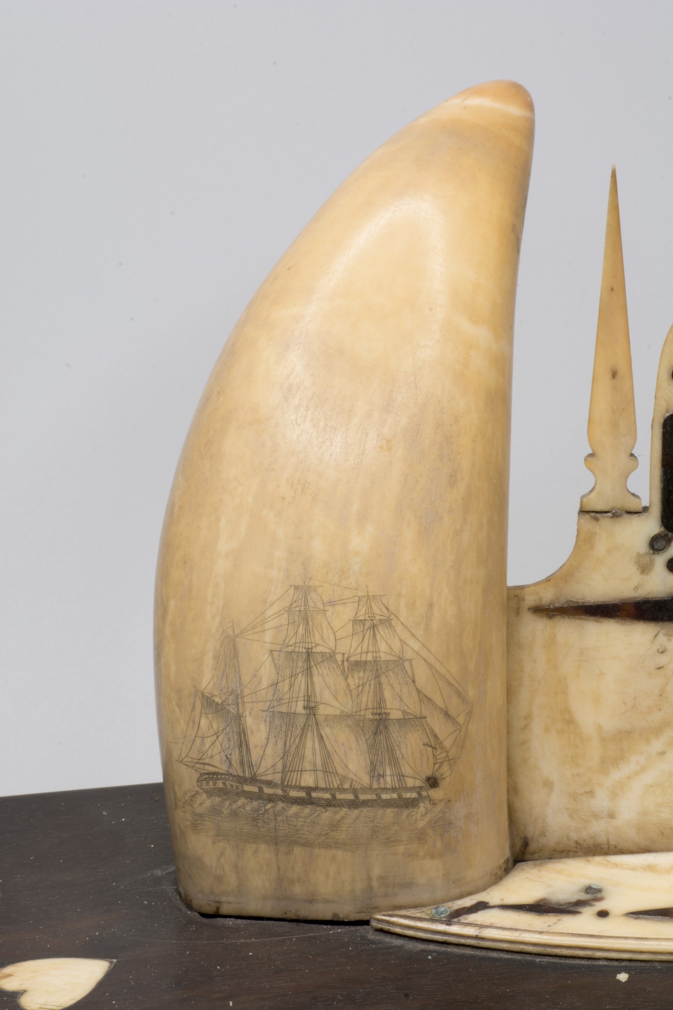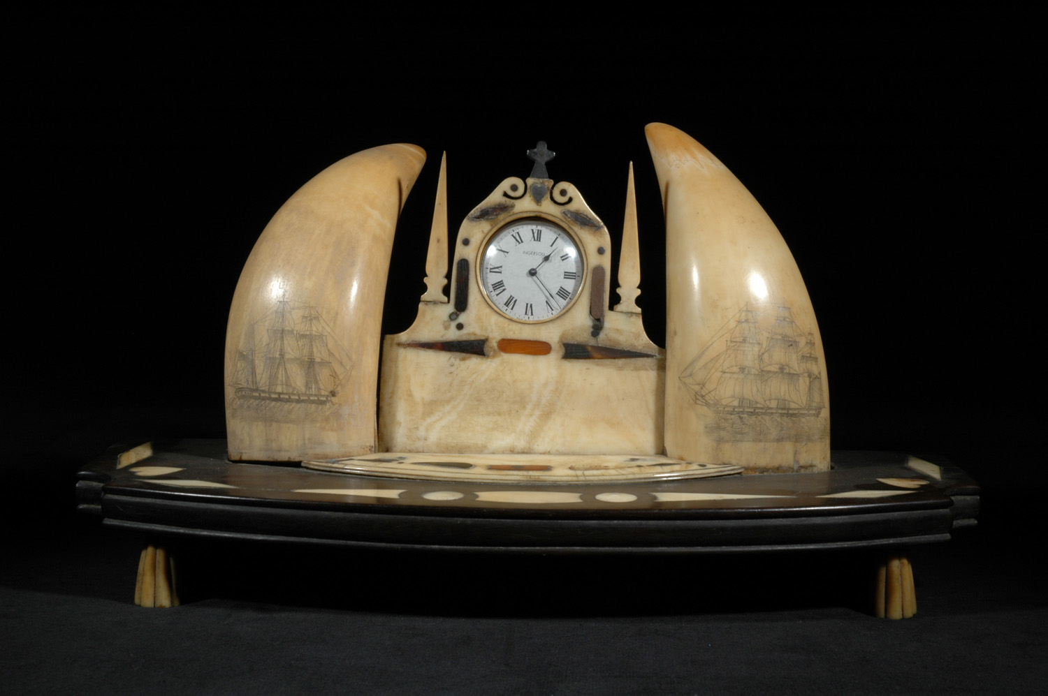 Scrimshaw watch stand of whale teeth (2) and ebony. Scrimshaw work on sp. whale teeth - evidence that some Orcadians were engaged in the South Seas whaling. A fleet of ships based in London sailed as far as Japan, taking up to 3 years on one whaling voyage.