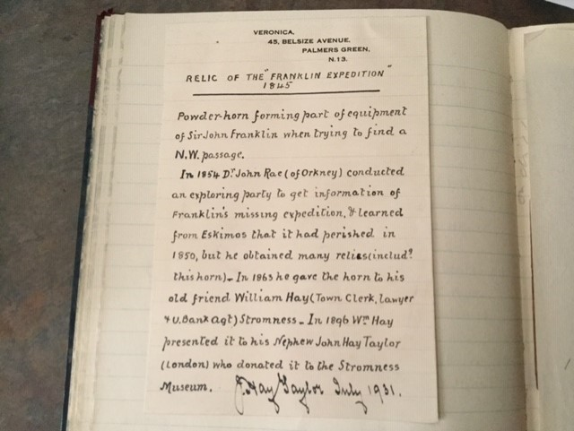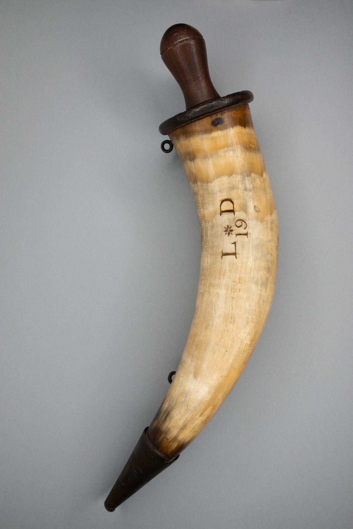 Powder horn made from natural horn with a metal tip and top lid. The letters L * D and number 19 are carved on it. It was brought back from the Arctic by Dr John Rae as a relic from the Franklin expedition of 1845.