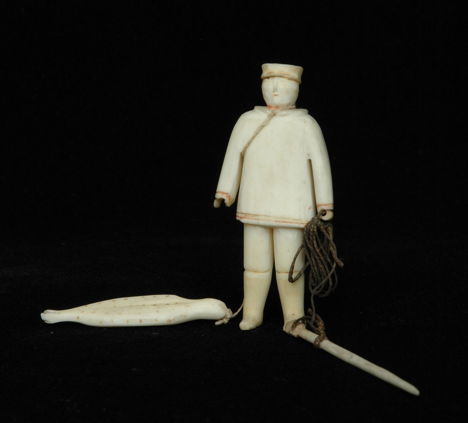 Inuit carving of a man and woman in Caribu Eskimo dress. Woman is carrying a bucket and is waring a very ornate dress. The man has a cap on his head and is wearinga tunic and leggings. He has a seal and harpoon.