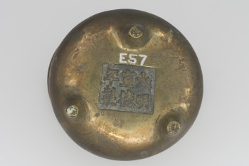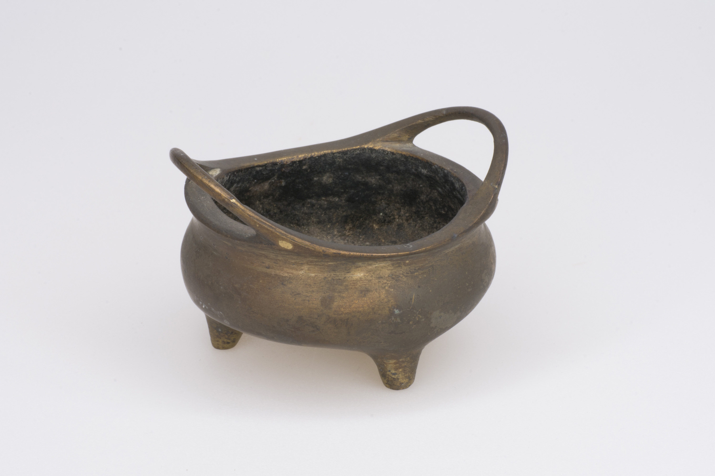 Cast bronze incense pot with two handles and three legs. The incense burner has a reign mark on its base, which reads Xuande period (1425-1435), Ming dynasty (1368-1644), and the vessel is likely to be made at a late date.
